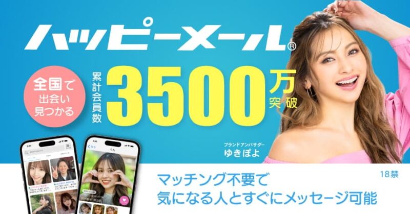 ハッピーメールは、累計会員数3,500万人以上を誇る国内最大級の出会い系アプリです。