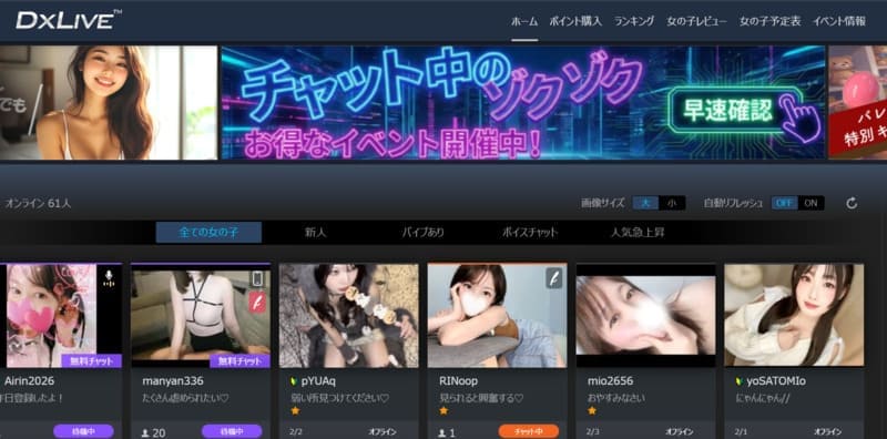 DXLIVEは海外ユーザー中心のライブチャットで、双方向ビデオによるその場で反応が返ってくるリアル感が魅力です。