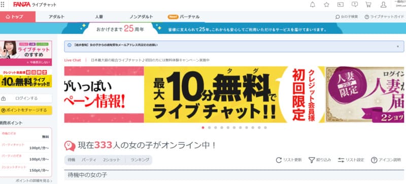 | 料金 | パーティーチャット:200pt/分 のぞき:150pt/分 2ショット:250pt/分 ※1pt=1円 |